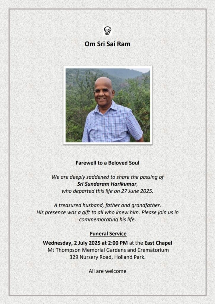 Funeral Notice – Hari Kumar Uncle – Brisbane Australia