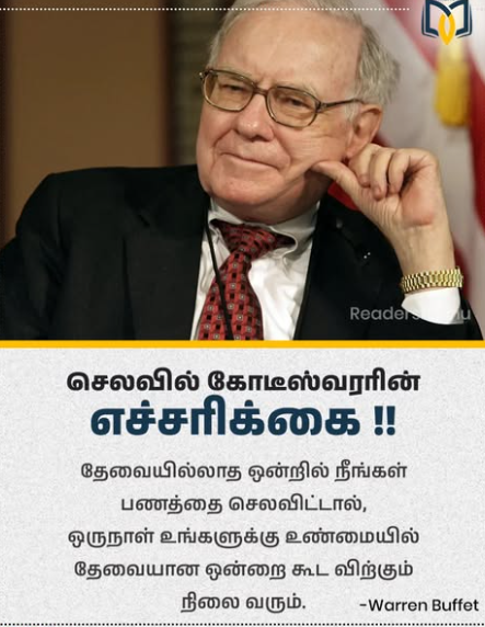 தேவையில்லாத செலவு… எதிர்காலத்தை பாதிக்கும் முதலாவது தவறு. இன்று கட்டுப்பாடு இல்லாமல் செலவிட்ட ஒரு ரூபாய், நாளை உங்கள் மிகவும் தேவையான ஒன்றை விற்கத் தூண்டும். பணம் சம்பாதிப்பது விட, அதை காப்பது தான் கலை. – Warren Buffet 2025-12-09